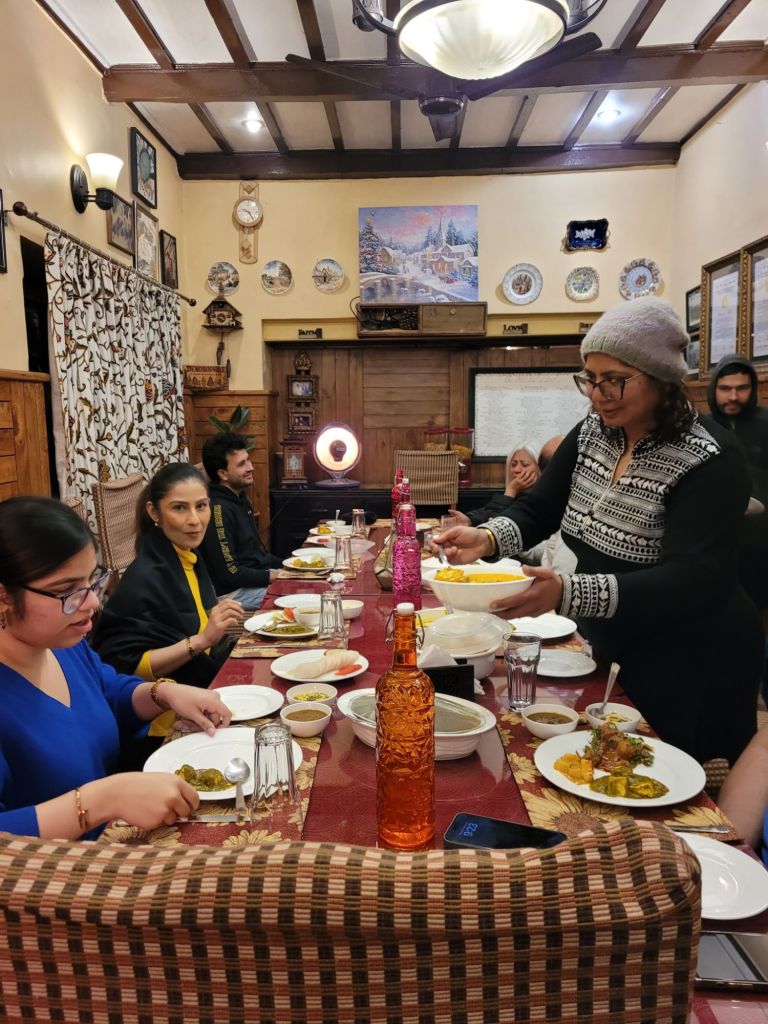 We met Sunita at dinner and got to know about this special ritual followed at La Villa Bethany for all the guests. We thought that dinner would just be like a buffet or being served at our table but Sunita and her husband Amarjeet invite everyone to this heritage dining table and serve not only food but will take you 200 years back with the stories of this home, British people finding this place or about the traditional food and culture of the mountains. We got Marathi cuisines that night and willingly overeaten as all the items were delicious and mostly healthy too. The menu is planned by Sunita in the morning after checking the local vegetable supplies, She told us that mostly it is procured by local farmers. Even the room supplies like linen, soaps, and souvenirs are also sourced from local women-run organizations. The food brings you a new taste and recipe every day based on different cuisines from a state or culture of India. The kitchen is passionately guided by Sunita as she believes in the magical experience of food and providing a homely feeling to the guests.