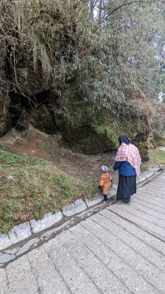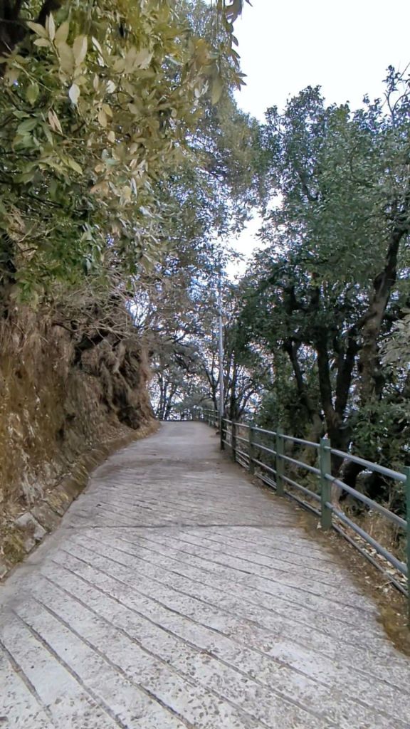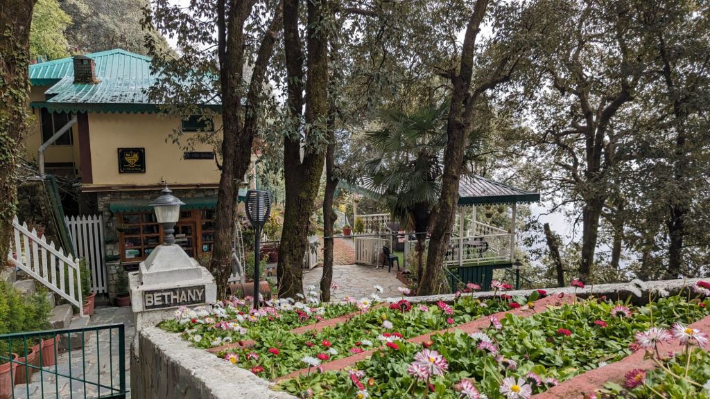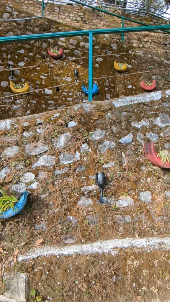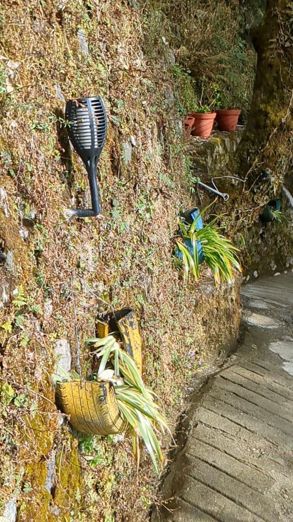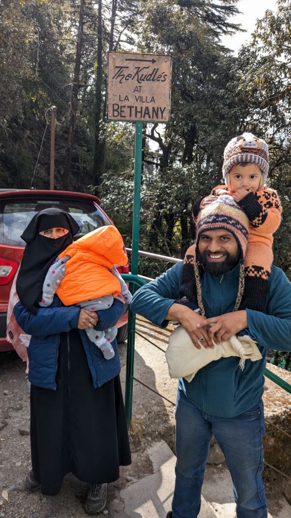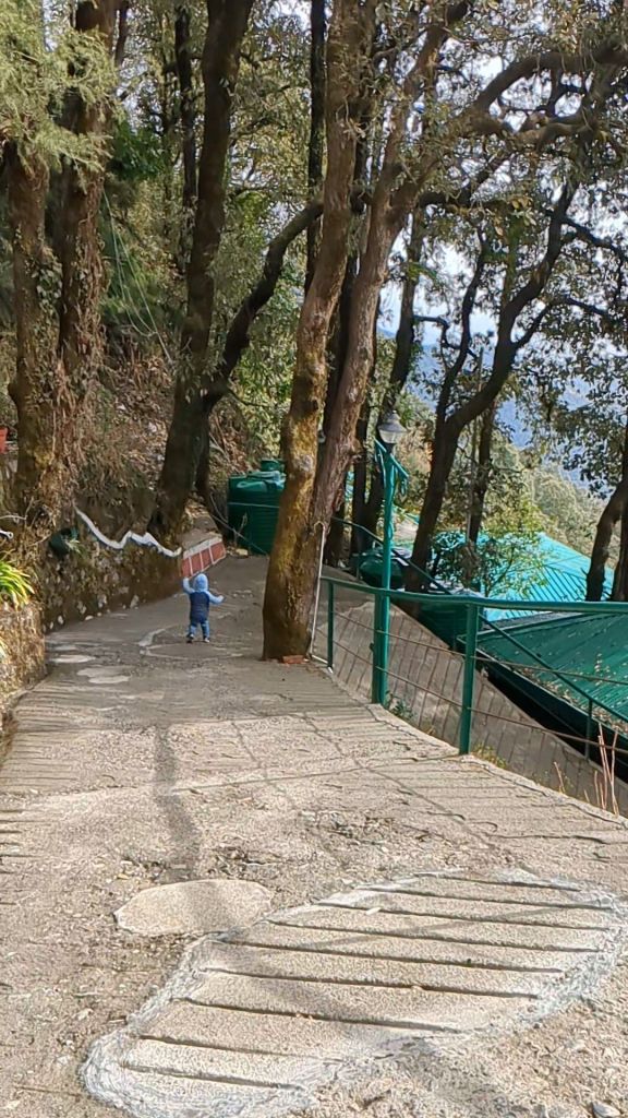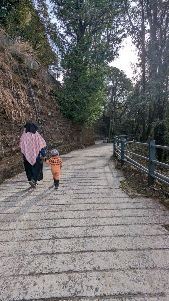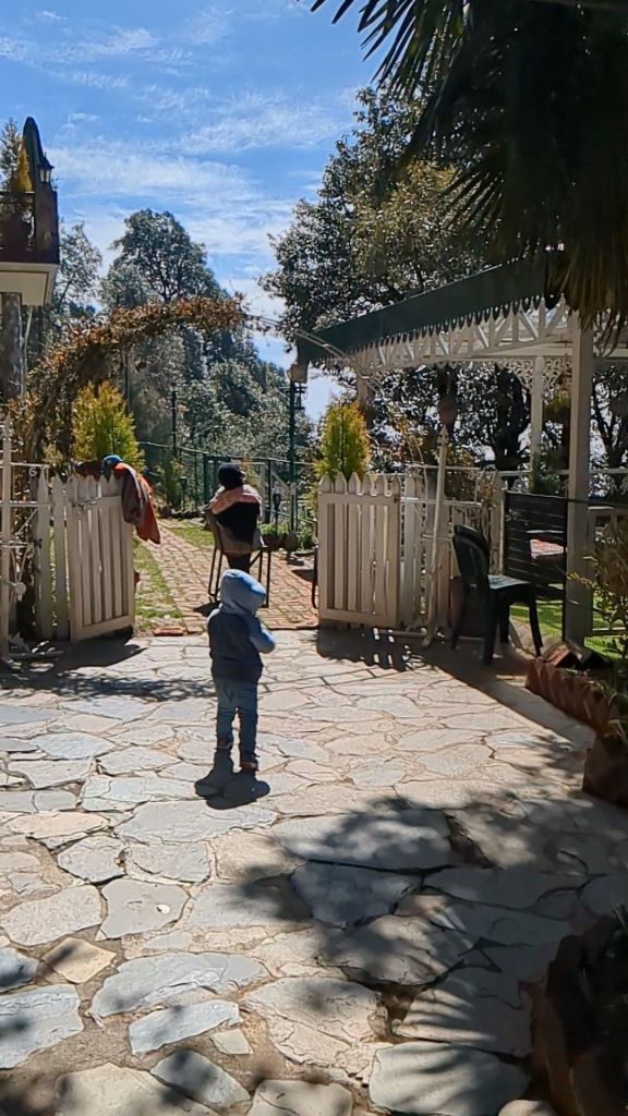 As we stepped down from the car, the chilly mountain air enveloped us and we quickly opened our luggage to wrap ourselves and our children in woolens. We were standing at this nameplate saying ‘ The Kudle’s, La Villa Bethany’, the stairs were going down from the road followed by a sloppy path till the entrance gate. Without waiting for anyone, Almeer started walking down the slope which made him almost run with his little feet, and we had to follow him. It took no or little effort to roll the trolley down while I carried the backpack. We were greeted by the tantalizing aroma of pine and Deodar trees, and Almeer, wide-eyed with wonder, took in the sights and sounds of his new surroundings, his laughter echoing through the crisp mountain air. It took us 10 minutes to walk this short distance as it was a beautiful path decorated with flower plants in recycled tires and bottles fixed on the stone wall and We tried to immerse ourselves in natural scenery with clouds passing by the tall trees around.