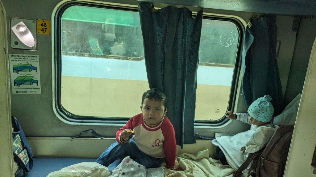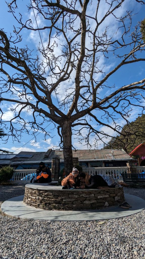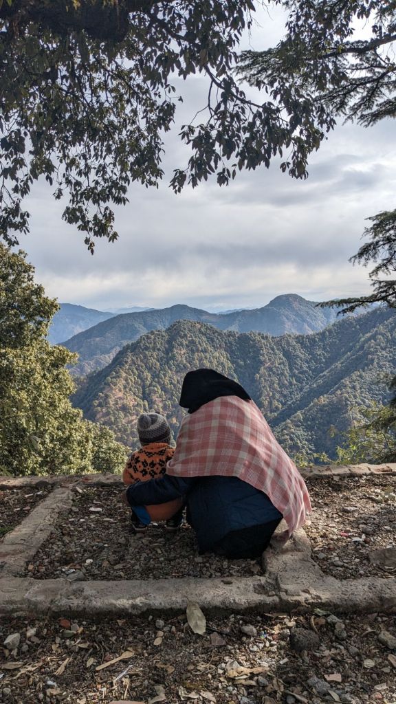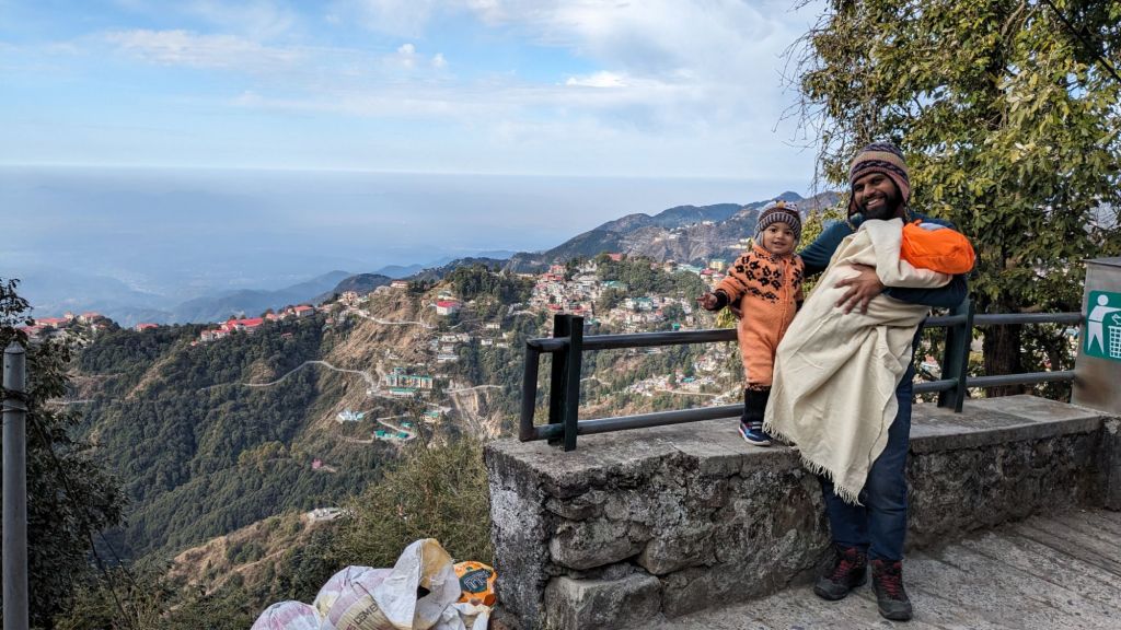 It was the time of spring and winter season saying it’s goodbye to the plains of northern India, from where we were traveling to this hill station as if chasing the cold breeze back to its home. We prefer a train journey for intercity travel with kids as it is comfortable and economical too, and kids love taking a train as they have space to play and enjoy while moving. Dehradun, the capital city that provides connectivity to the twin hill stations of Mussoorie and Landour, surprisingly made us remove our warm clothes when we reached here at noon. There is a bus stand near Dehradun railway station from where regular buses are available for nearby towns, we wanted to take a bus to Mussoorie and then find some conveyance to go to Landour which is just 5 Km from there. We missed a bus by a few minutes and there was some time for the next. While I was in a queue for the next bus ticket, Almeer wandered curiously, while Ali peacefully slept. Some men were constantly shouting at a loudspeaker placed in front of the bus stand about a shared car ride to Mussoorie, it was a taxi booking counter. Being impatient while waiting for the bus, we decided to take 2 seats in a taxi and they made us wait even more after taking the booking amount. Anyway, we started moving towards the hills visible ahead of us. The driver was a chilled middle-aged man who never crossed the speed of 50 kmph and enjoyed the old Bollywood songs the whole way. We gained some height after one hour and started feeling cold but had put our warm clothes in our luggage at the back, we could see the whole of Dehradun city spread over miles and miles beneath.